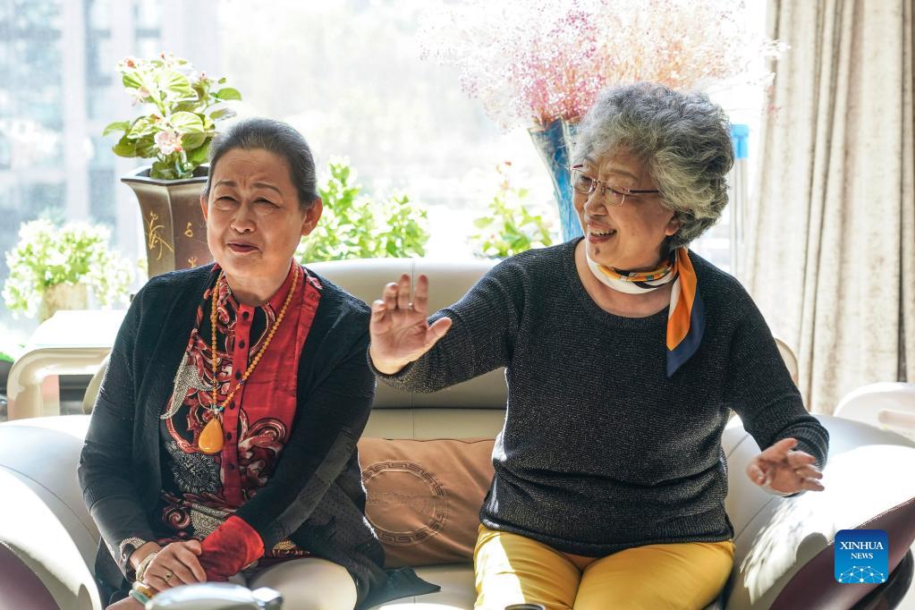 Li Zhanping (R) gathers with her friend at home in Beijing, capital of China, Oct. 11, 2021. In recent years, many senior people in Beijing choose to spend their elderly life at nursing houses in other surrounding cities. Three years ago, the 80-year-old Beijinger Lyu Weiye, together with his wife Li Zhanping, decided to rest their remaining years at a nursing institution in Hebei Province, which is located only 30 kilometers away from Beijing. Now they live a very comfortable life between the two cities, enjoying the medical services at the nursing institution as well as gathering with their old friends in Beijing. (Xinhua/Peng Ziyang)