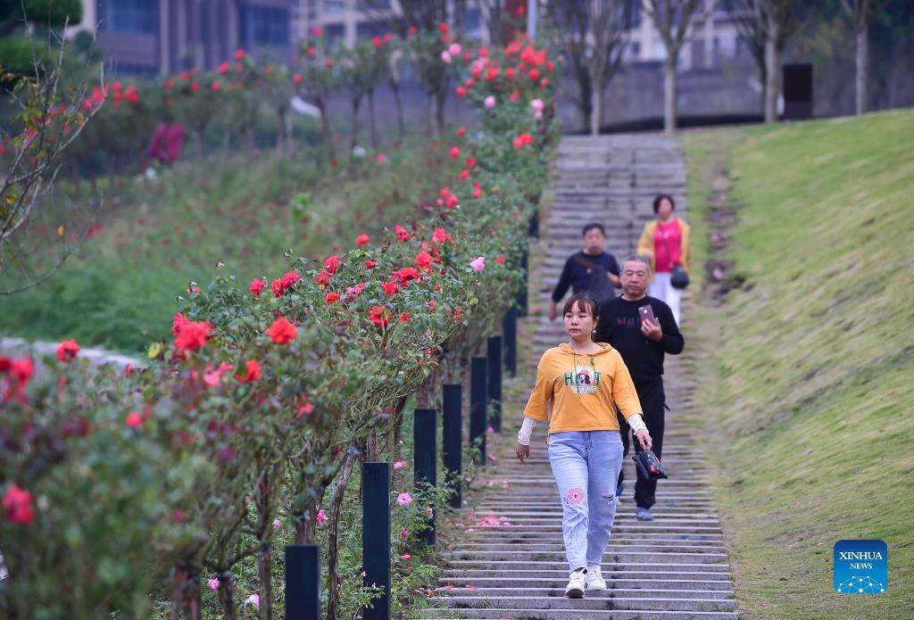 People take a walk at a waterside park in southwest China's Chongqing, Oct. 14, 2021. A 33km waterside walkway, which links six areas and eight parks in different themes along two rivers, was built in Yunyang district of Chongqing, providing residents a nice place to spend their leisure time. (Xinhua/Wang Quanchao)