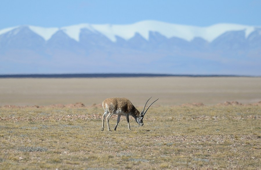 A Tibetan antelope is seen at Hol Xil area of Sanjiangyuan National Park in northwest China's Qinghai Province, Sept. 28, 2021. (Xinhua/Xue Yubin)