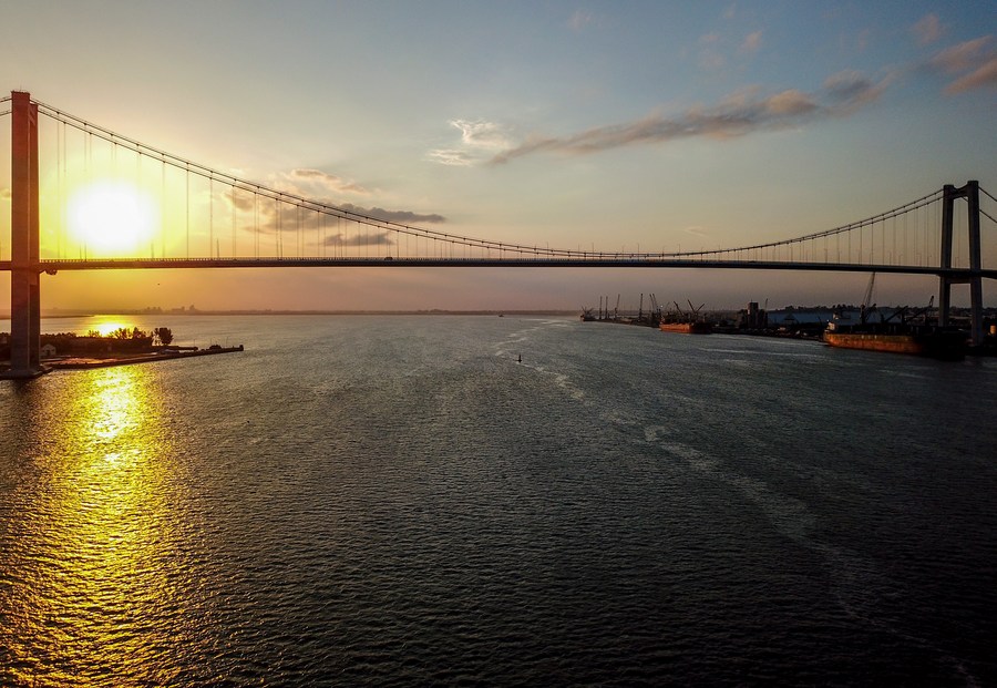 Aerial photo taken on April 9, 2019 shows a night view of the Maputo Bay Bridge, which is part of the Maputo Bridge and Link Roads project built by the China Road and Bridge Corporation in Maputo, Mozambique. (Xinhua/Zhang Yu)