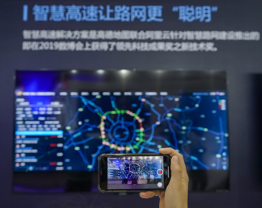 A visitor takes a picture of a smart system to improve public transportation network during the World Transport Convention held at China National Convention Center in Beijing, capital of China, June 14, 2019. (Xinhua/Shen Bohan)