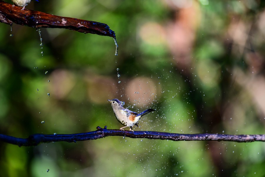 A bird bathes at the "bird pond" built by Hou Tiguo in Baihualing, a village sitting at the eastern foot of the Gaoligong Mountains, Baoshan City, southwest China's Yunnan Province, on Dec. 4, 2020. (Xinhua/Hu Chao)