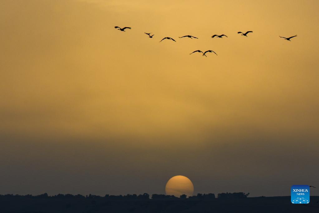 A flock of migrating gray cranes are seen at the Agamon Hula Conservation Lake in north Israel, Oct. 14, 2021. Every year, hundreds of thousands of birds past Agamon, a major stopover for migrating birds along the Syrian-African Rift, making their way to Africa then back to Europe, and some spend the winter at the Lake. (Photo by Ayal Margolin/JINI via Xinhua)