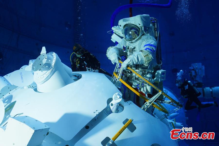 Chinese astronaut Wang Yaping conducts walking out of the capsule training underwater, March 8, 2021. (Photo/Xu Bu)