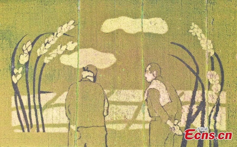 This photo taken on Oct. 14, 2021, shows rice paddy field painting "Giant Ears of Rice" and "Laborers" in Hangzhou, Zhejiang Province. (Photo: China News Service/Wang Gang)