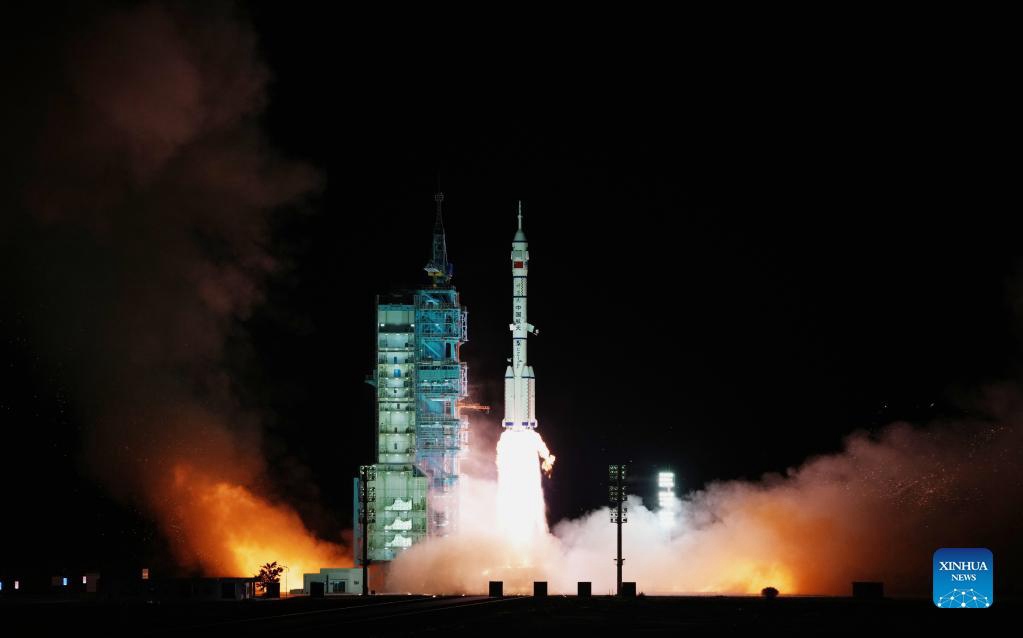 The crewed spaceship Shenzhou-13, atop a Long March-2F carrier rocket, is launched from the Jiuquan Satellite Launch Center in northwest China's Gobi Desert, Oct. 16, 2021. (Xinhua/Li Gang)
