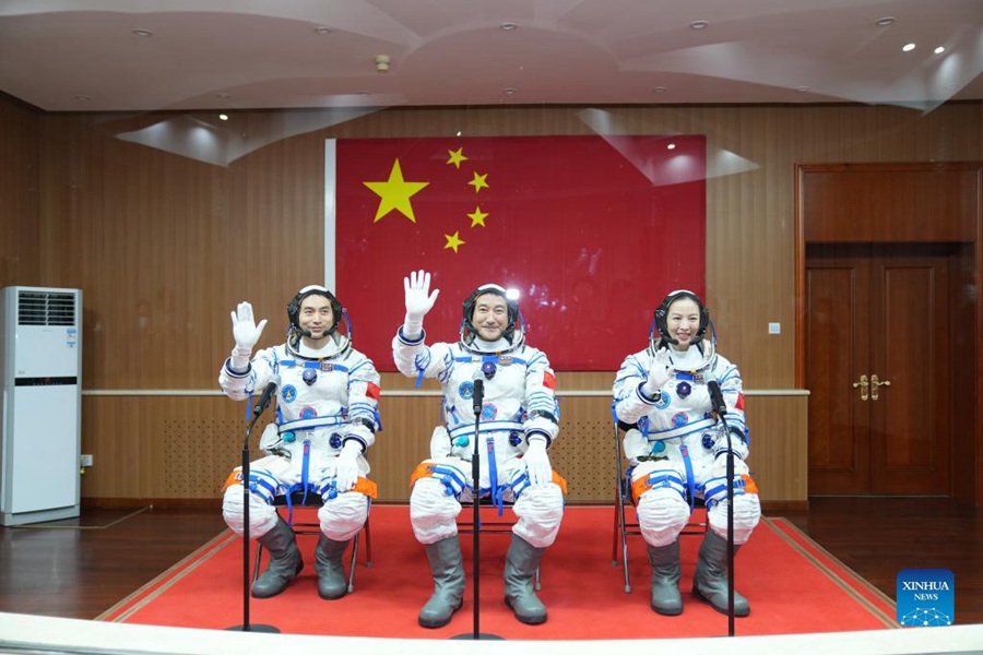 A see-off ceremony for three Chinese astronauts of the Shenzhou-13 crewed space mission is held at the Jiuquan Satellite Launch Center in northwest China, Oct. 15, 2021. Chinese astronauts Zhai Zhigang (C), Wang Yaping (R) and Ye Guangfu will stay in space for about six months. (Xinhua/Li Gang)