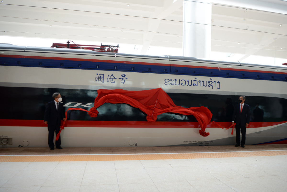Chinese ambassador to Laos Jiang Zaidong (left) and Lao Minister of Public Works and Transport Viengsavath Siphandone attend an unveiling ceremony for the Lane Xang EMU train at the China-Laos railway Vientiane station in the Lao capital Vientiane, Oct 16, 2021. [Photo/Xinhua]