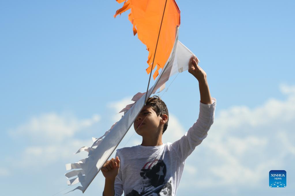 A boy prepares to fly a kite during the 4th edition of the International Kite and Wind Festival in the village of Gharb on the island of Gozo, Malta, on Oct. 17, 2021. (Xinhua/Jonathan Borg)