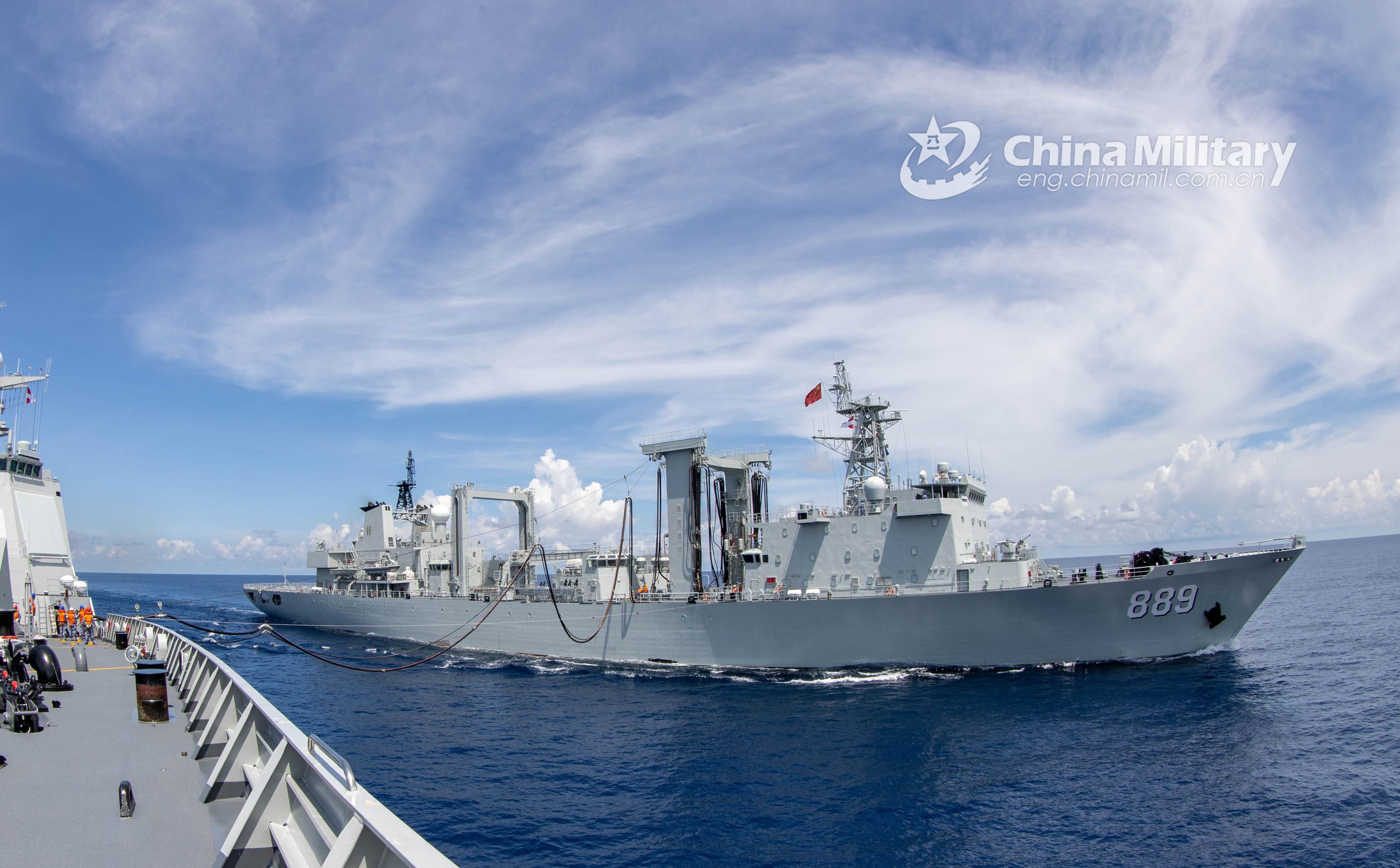 Sailors assigned to the 39th Chinese naval escort taskforce connect a fuel probe from the comprehensive supply ship Taihu (Hull 889) to their ship during a replenishment-at-sea operation in waters of the South China Sea on October 1, 2021. The 39th Chinese naval escort taskforce is composed of the guided-missile destroyer Urumqi (Hull 118), guided-missile frigate Yantai (Hull 538), and comprehensive supply ship Taihu (Hull 889), together with two shipborne helicopters and dozens of special operations soldiers. It is the first time for Destroyer Urumqi to carry out the escort mission. (eng.chinamil.com.cn/Photo by Zhao Yang)