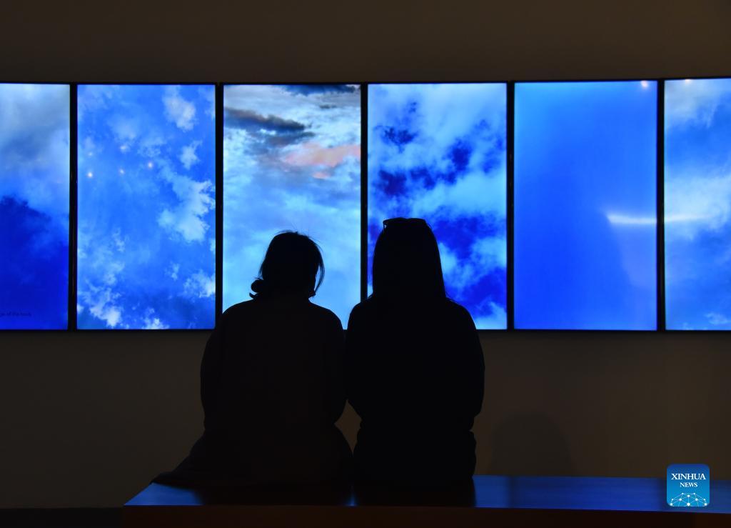 Visitors watch an video installation at the BIENALSUR exhibition in JAX, Diriyah, Riyadh, Saudi Arabia, on Oct. 16, 2021. The exhibition opened for public on Saturday in Diriyah under the title "Echoes: A World Between Analogue &Virtual". (Xinhua/Wang Haizhou)