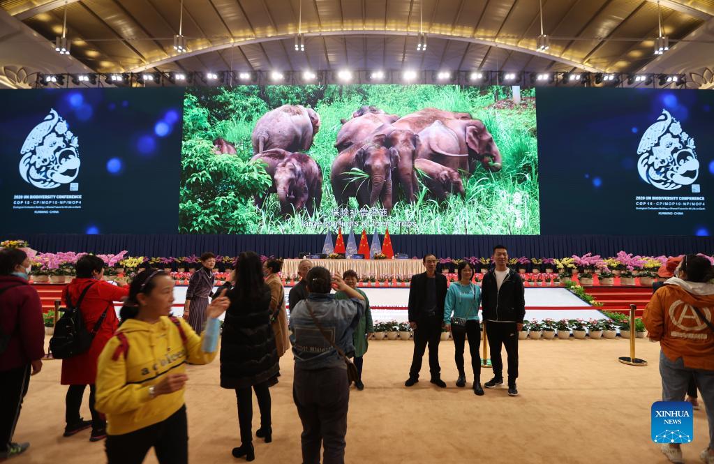 Visitors take photos at the Kunming Dianchi International Convention &Exhibition Center, a venue of the 15th meeting of the Conference of the Parties to the United Nations Convention on Biological Diversity (COP15), in Kunming, southwest China's Yunnan Province, Oct. 18, 2021. Venues of the COP15 are opened to the public free of charge from Oct. 18 to Nov. 7. (Photo by Liang Zhiqiang/Xinhua)