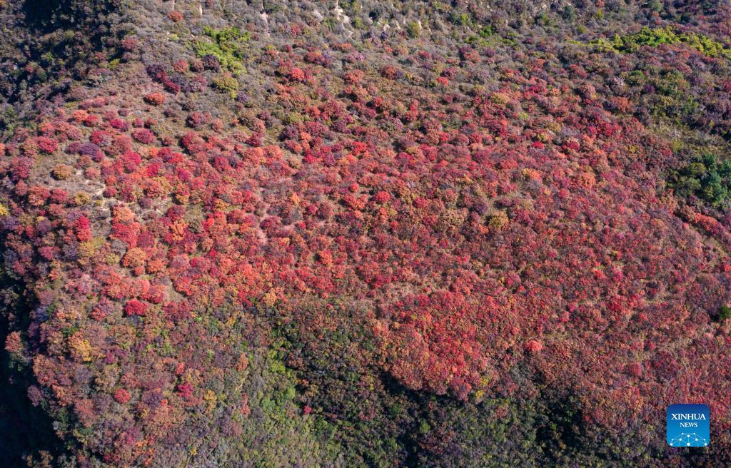 Aerial photo taken on Oct. 18, 2021 shows the autumn scenery at Baiyun mountain scenic spot in Wuan City, north China's Hebei Province. (Xinhua/Luo Xuefeng)