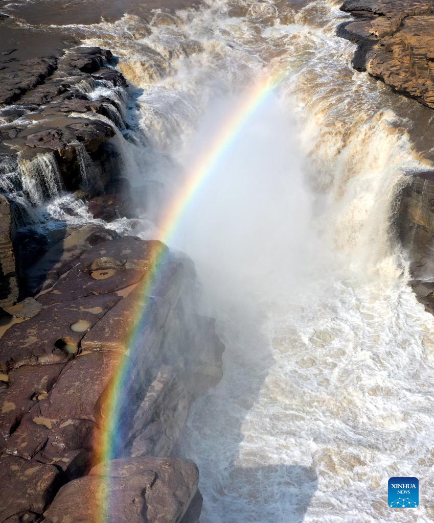 Aerial photo taken on Oct. 18, 2021 shows a rainbow over the Yellow River's Hukou Waterfall in northwest China's Shaanxi Province. (Xinhua/Tao Ming)