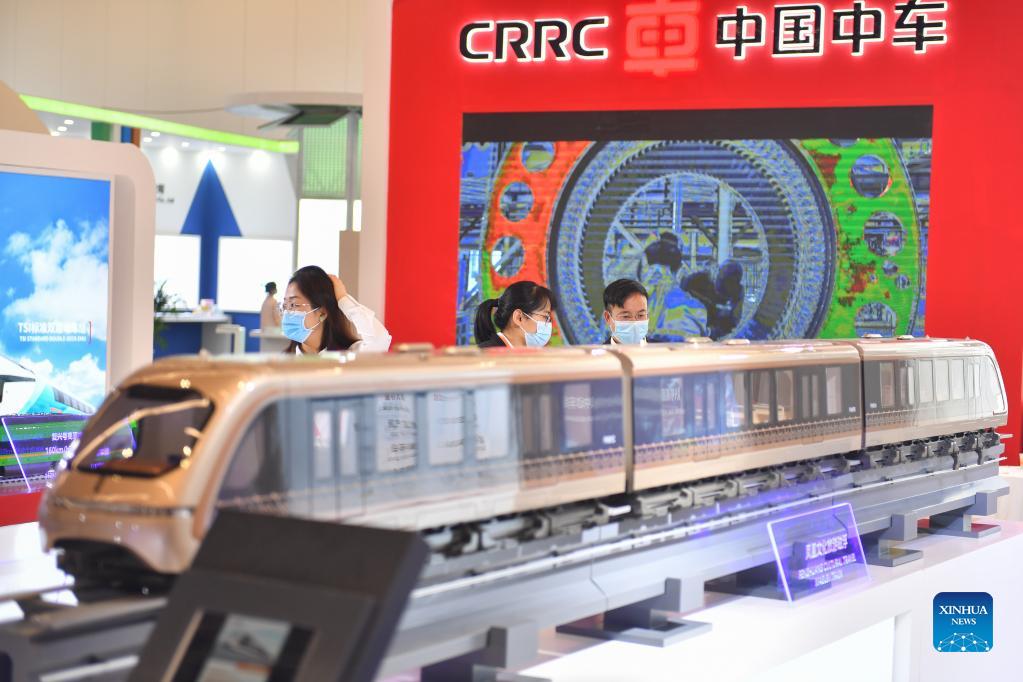People visit the exhibition area of the China Railway Rolling Stock Corporation (CRRC) during the Global Economic Development and Security Forum Expo of the Boao Forum for Asia (BFA) in Changsha, central China's Hunan Province, Oct. 18, 2021. With the theme of economic security and sustainable development in a world of great change, the three-day forum aims to provide a high-end platform for promoting dialogue between political and business leaders from around the world. (Xinhua/Chen Zeguo)