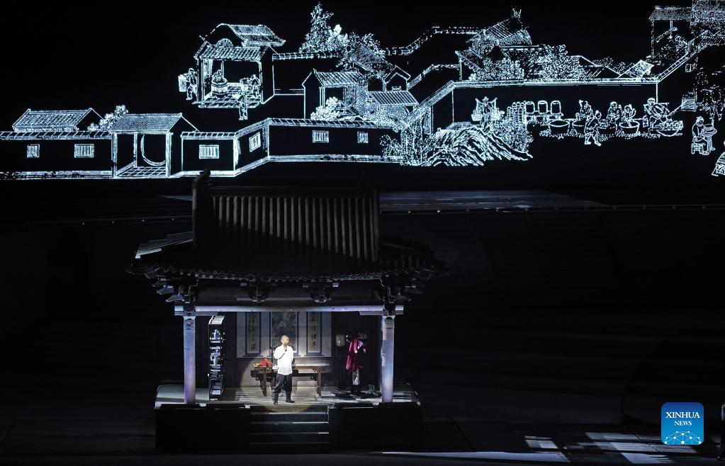 Photo taken on Oct. 17, 2021 shows a scene from the debut of "china," a live-action performance, in Jingdezhen City, east China's Jiangxi Province. The performance artistically reflects the thousand-year development of porcelain making and the history of Jingdezhen, dubbed the ancient porcelain capital of the country. (Xinhua/Wan Xiang)