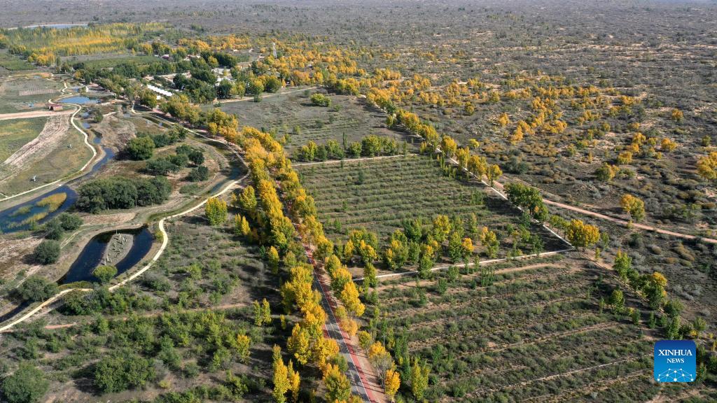 Aerial photo taken on Oct. 15, 2021 shows the autumn scenery at Haba Lake nature reserve of Yanchi County, northwest China's Ningxia Hui Autonomous Region. (Xinhua/Wang Peng)