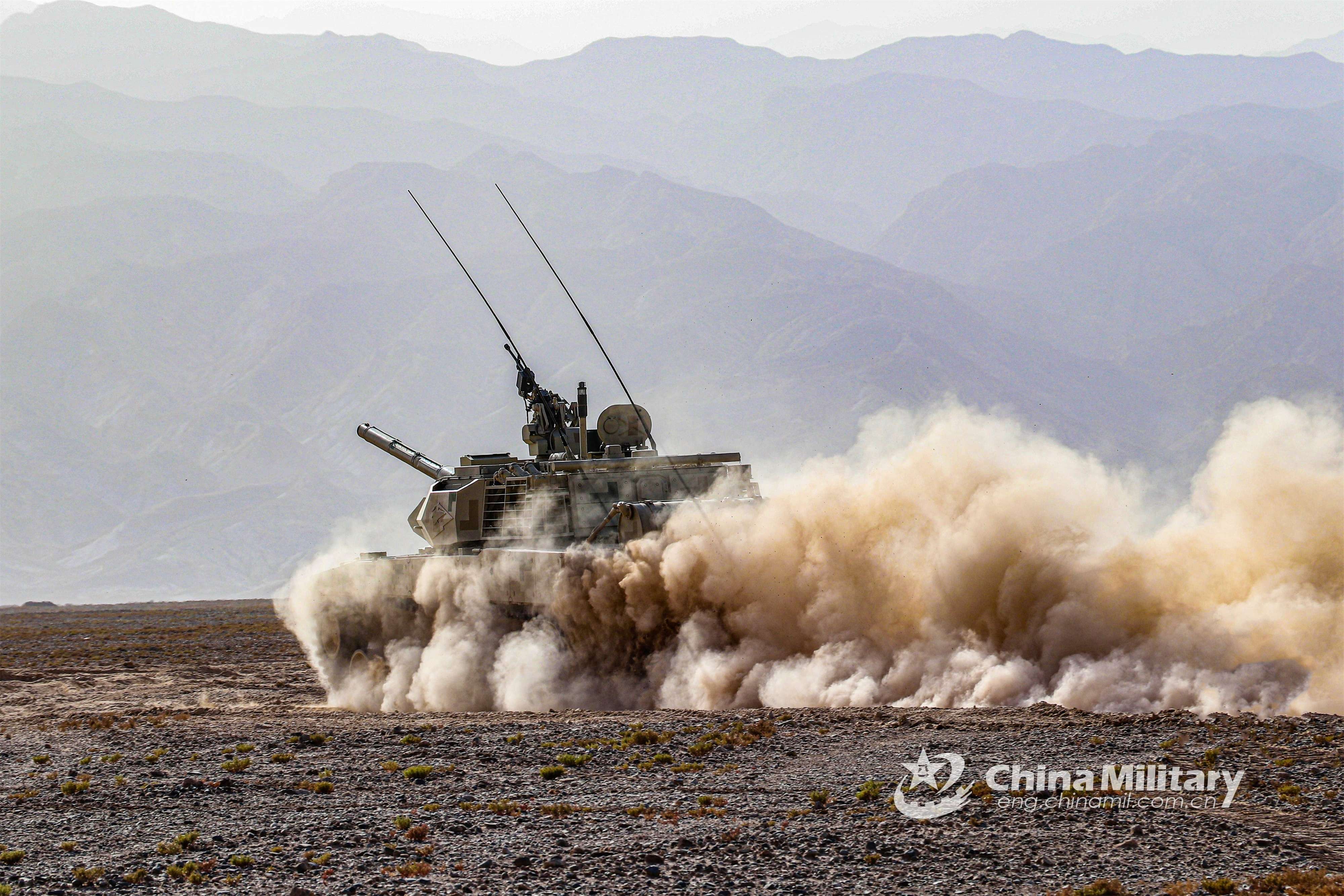 Main battle tanks (MBTs) attached to a combined-arms regiment under the PLA Xinjiang Military Command rumble in formation towards the designated training field on September 27, 2021. (eng.chinamil.com.cn/Photo by Chen Ming)
