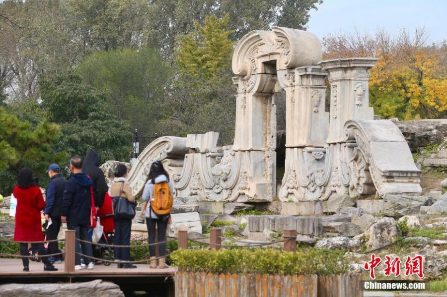 Tourists visit the Dashuifa Site (fountain site) at Yuanmingyuan Ruins Park, Beijing, Oct. 18, 2021. (Photo: China News Service/Yi Haifei)