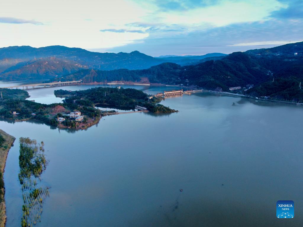 Aerial photo taken on Oct. 18, 2021 shows the scenery of Hanfeng Lake in Kaizhou District of Chongqing, southwest China. (Xinhua/Liu Chan)