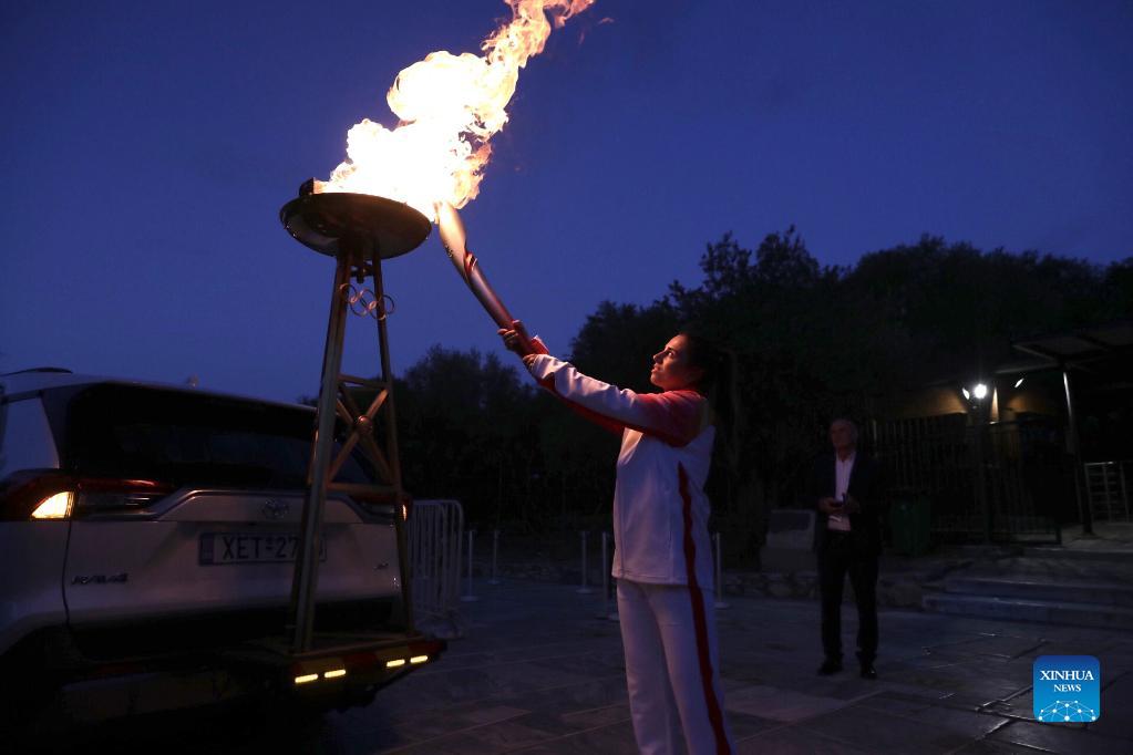 Ariadni Spanaki, Greek sailing athlete, lights the torch with the Flame for the Beijing 2022 Winter Olympic Games, at Acropolis in Athens, Greece, on Oct. 18, 2021. The Flame for the Beijing 2022 Winter Olympic Games was burning overnight at the Hill of Acropolis and on Tuesday morning it was transferred to the Panathenaic Stadium to be handed over to the organizers of the Beijing 2022 Winter Olympic Games. (Photo by Lefteris Partsalis/Xinhua)
