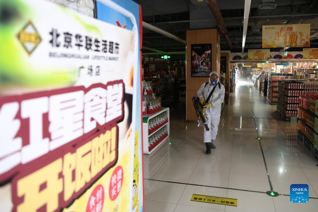 A staff member disinfects a shopping center in Chengguan District of Lanzhou, northwest China's Gansu Province, Oct. 19, 2021. Local authorities have strengthened the prevention and control measures to halt the spread of the coronavirus in the recent COVID-19 resurgence. (Xinhua/Fan Peishen)