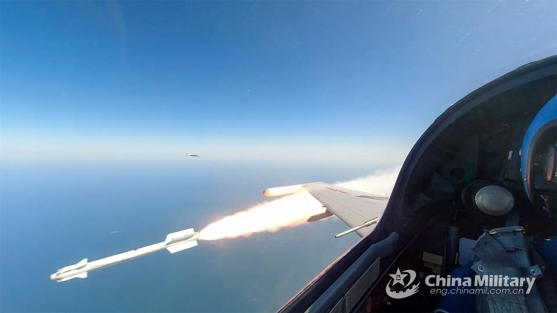 Fighter jets attached to a naval aviation brigade under the PLA Eastern Theater Command fire at targets during a live-fire training exercise on September 15, 2021. (eng.chinamil.com.cn/Photo by Zhao Ningning)
