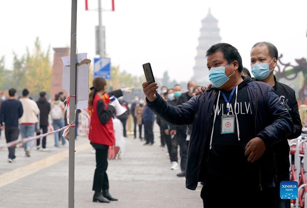 Citizens wait to receive nucleic acid testing at a testing site in Xi'an, northwest China's Shaanxi Province, Oct. 19, 2021. Shaanxi Province has reported seven locally transmitted COVID-19 confirmed cases and one asymptomatic case as of Monday in the recent COVID-19 resurgence. The authorities have strengthened the prevention and control measures to halt the spread of the coronavirus. (Xinhua/Liu Xiao)