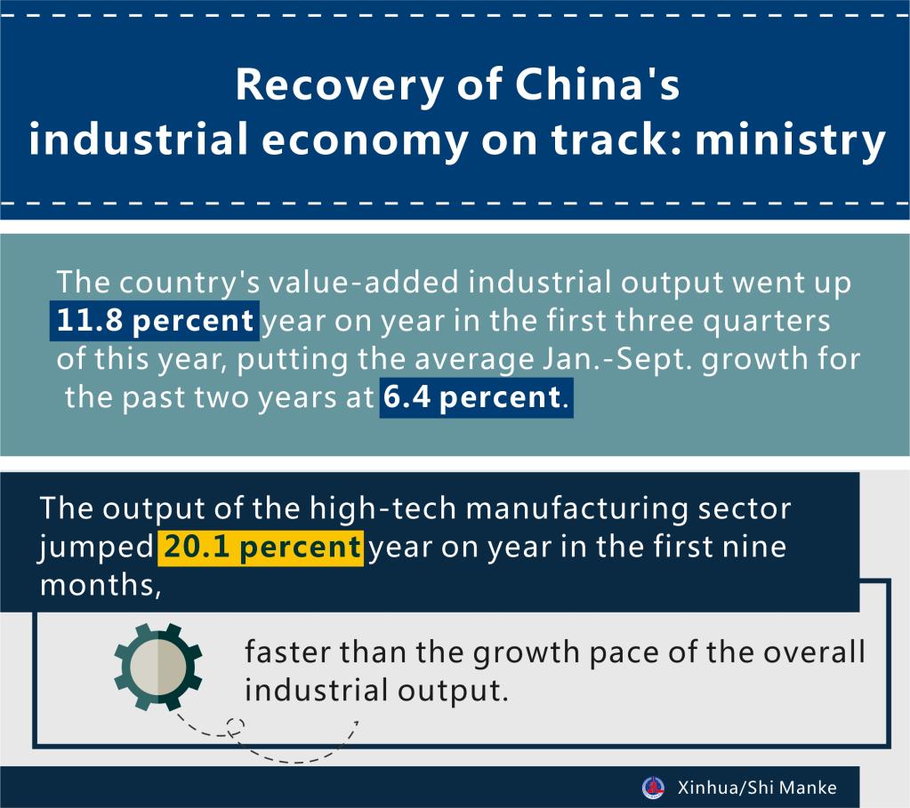 BEIJING, Oct. 19 (Xinhua) -- The recovery of China's industrial economy is on track with strong resilience and momentum, the Ministry of Industry and Information Technology said Tuesday.