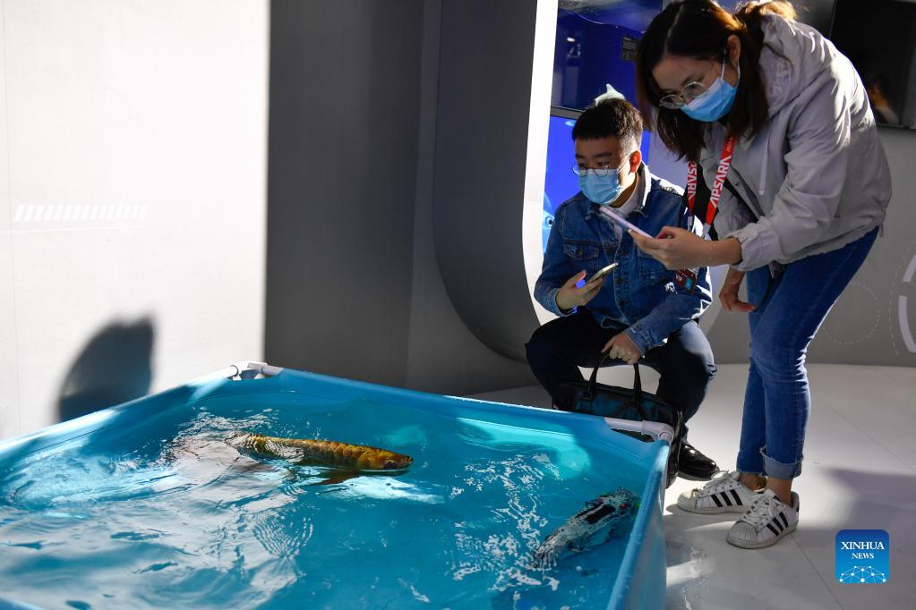 People look at a bionic fish during the 2021 Apsara Conference in Hangzhou, east China's Zhejiang Province, Oct. 19, 2021. The four-day conference kicked off in Hangzhou on Tuesday. The Apsara Conference, formerly known as Ali cloud developers' conference, is the earliest platform showcasing innovations in China. (Xinhua/Huang Zongzhi)
