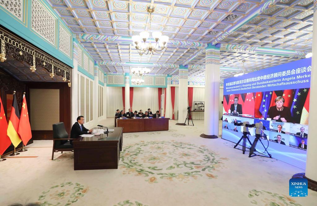 Chinese Premier Li Keqiang attends a meeting of the China-Germany economic advisory committee with German Chancellor Angela Merkel via video link, in Beijing, capital of China, Oct. 18, 2021. (Xinhua/Liu Weibing)