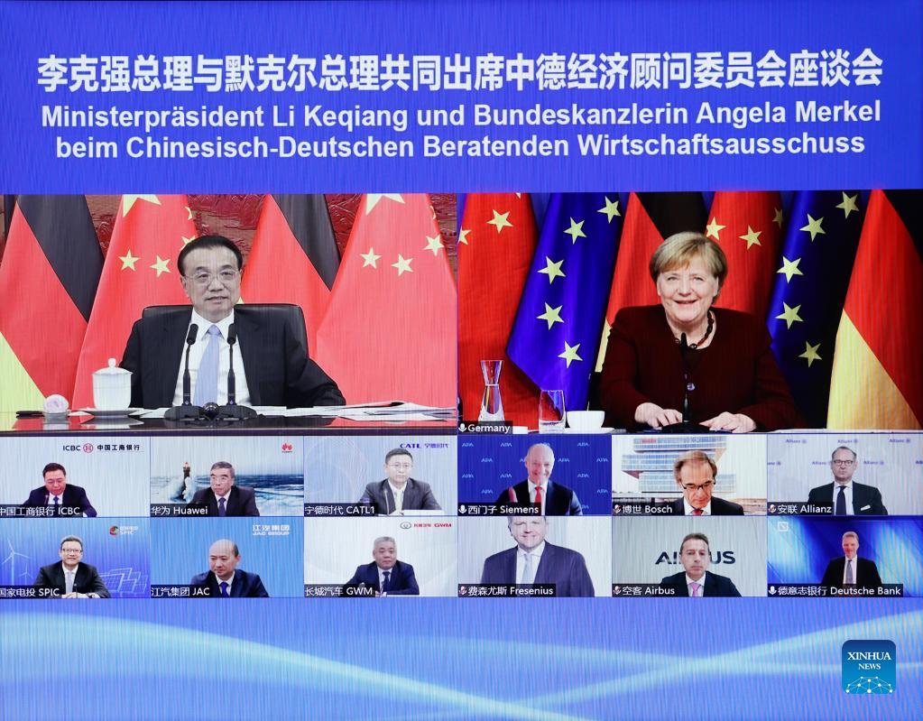 Chinese Premier Li Keqiang attends a meeting of the China-Germany economic advisory committee with German Chancellor Angela Merkel via video link, in Beijing, capital of China, Oct. 18, 2021. (Xinhua/Liu Bin)