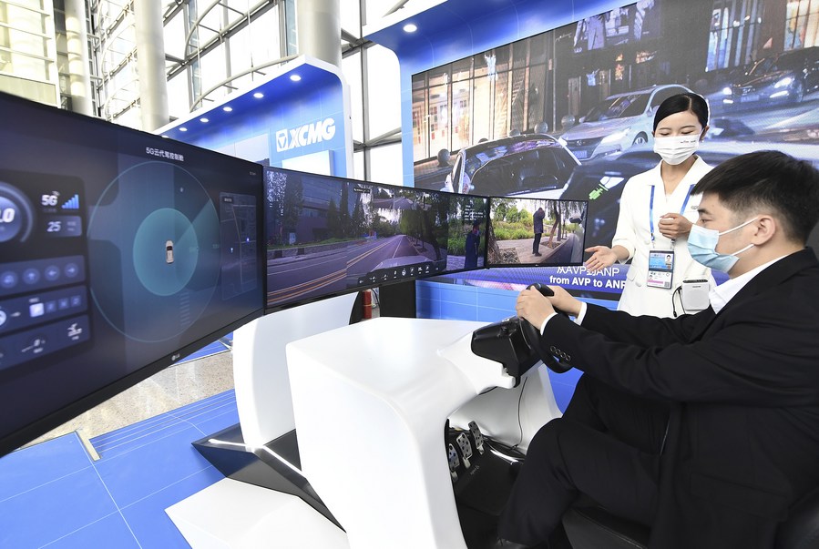 A visitor tries a 5G driving simulation system at the venue of the Second United Nations Global Sustainable Transport Conference in Beijing, capital of China, Oct. 14, 2021. (Xinhua/Li He)