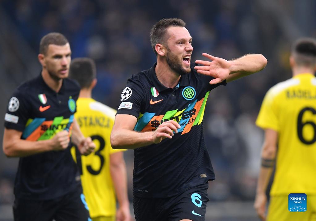 FC Inter's Stefan De Vrij celebrates his goal during the UEFA Champions League Group D match between FC Inter and FC Sheriff Tiraspol in Milan, Italy, Oct. 19, 2021. (Str/Xinhua)