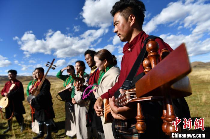 Several artists sing Tibetan songs accompanied by Longtouqin, or dragon-head harp, on Hongyuan Prairie of Aba Tibetan and Qiang Autonomous Prefecture, Sichuan Province, Oct. 19, 2021. (Photo: China News Service/Zhang Lang)