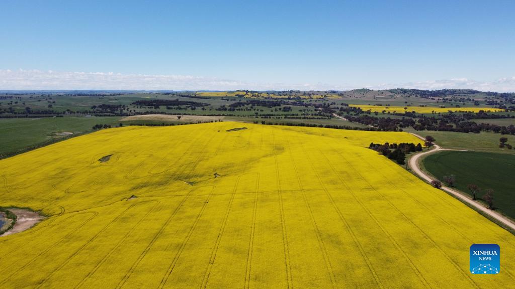 Aerial photo taken on Oct. 19, 2021 shows a view of a canola field outside Canberra, capital of Australia. (Photo by Jiang Chenyi/Xinhua)