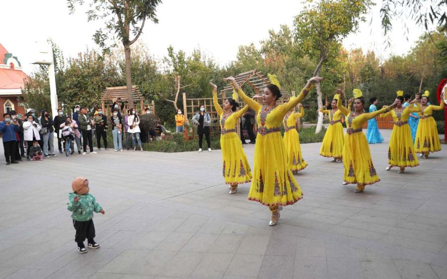 People dance at Liuxing street in Yining, Xinjiang Uygur autonomous region, on Sept 29, 2021.(Photo: chinadaily.com.cn/Zou Hong)
