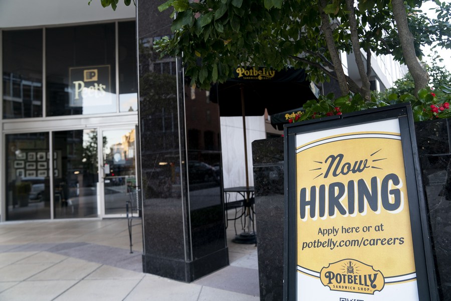 Photo taken on Sept. 3, 2021 shows a hiring notice in front of a restaurant in Washington, D.C., the United States. (Xinhua/Liu Jie)