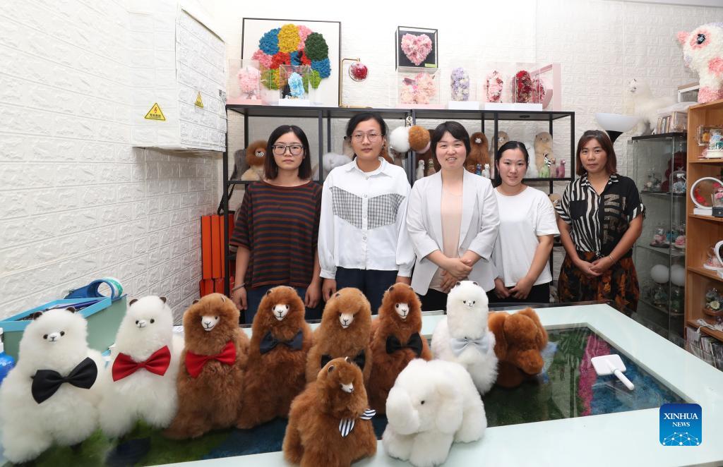 Ma Yuxia (C) and her employees pose for group photos in her office at the Peru Import Pavillon of the Greenland Global Commodity Trading Hub in Shanghai, east China, Oct. 15, 2021. At the first China International Import Expo (CIIE), Ma Yuxia, a Chinese businesswoman based in South America, introduced the plush toy alpacas made by Uncle Mamani, a Peruvian craftsman, into the Chinese market. Ma and her Peruvian partners rented a booth of merely 9 square meters at the first CIIE to display and promote these toys and other traditional hand-made artcrafts in Peru. They also established their own brand, known as Warmpaca (meaning "warm alpaca"). The business was unexpectedly successful. After participating in the CIIE for three consecutive years, Ma and her partners gained access to the Chinese market with these cute little "alpacas". At the 4th CIIE, Ma's booth is to expand fourfold. On the other side of the Pacific, Uncle Mamani's family has built a new house, bought a car, and involved nearly 200 people from his village in his business. (Xinhua/Fang Zhe)