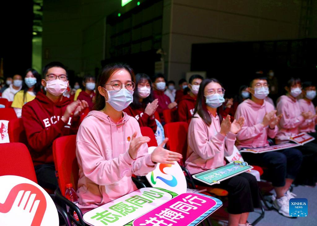 Volunteers of the upcoming fourth China International Import Expo (CIIE) participate in a swearing-in ceremony at the National Exhibition and Convention Center (Shanghai) in east China's Shanghai, Oct. 20, 2021. More than 4,700 people were sworn in as volunteers on Wednesday and started going about with their duties for the fourth CIIE scheduled from Nov. 5 to 10 in Shanghai, according to local authorities. Tens of thousands of volunteers have provided services since the first CIIE in 2018 to ensure the smooth running of the expo. (Xinhua/Liu Ying)
