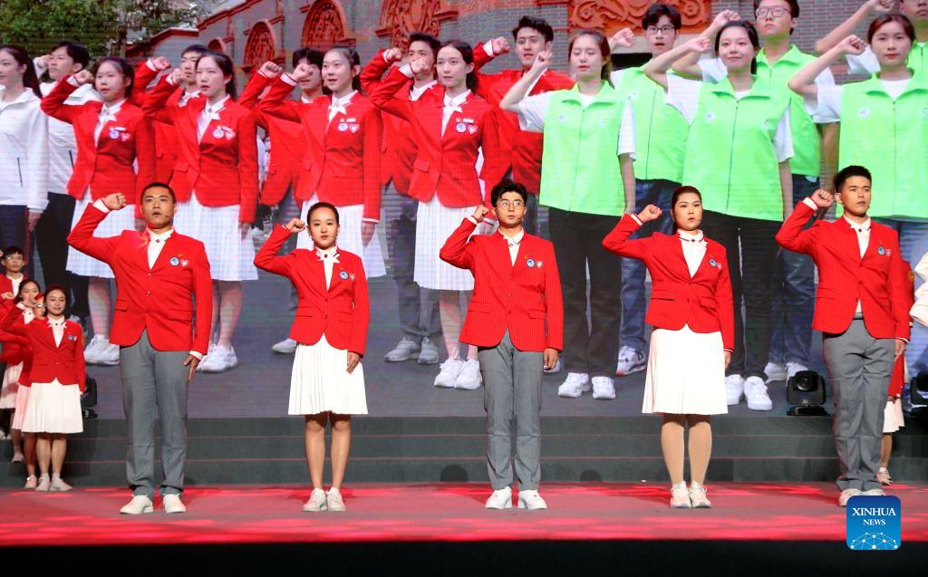 Volunteers of the upcoming fourth China International Import Expo (CIIE) participate in a swearing-in ceremony at the National Exhibition and Convention Center (Shanghai) in east China's Shanghai, Oct. 20, 2021. More than 4,700 people were sworn in as volunteers on Wednesday and started going about with their duties for the fourth CIIE scheduled from Nov. 5 to 10 in Shanghai, according to local authorities. Tens of thousands of volunteers have provided services since the first CIIE in 2018 to ensure the smooth running of the expo. (Xinhua/Liu Ying)
