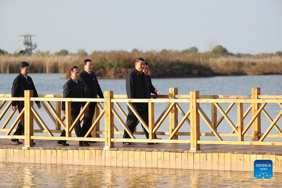 Chinese President Xi Jinping, also general secretary of the Communist Party of China Central Committee and chairman of the Central Military Commission, checks the ecological environment of the wetlands in the Yellow River Delta and learns about the ecological protection and high-quality development of the Yellow River basin at a national-level nature reserve of the river delta as he inspects the estuary of the Yellow River in the city of Dongying, east China's Shandong Province, Oct. 20, 2021. (Xinhua/Wang Ye)