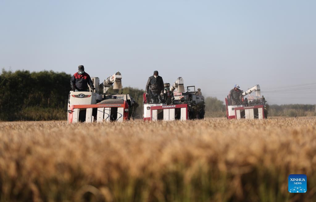 Photo taken on Oct. 21, 2021 shows farmers operating harvesters on a rice field in Wangtan Town of Tangshan, north China's Hebei Province. (Xinhua/Zhu Xudong)
