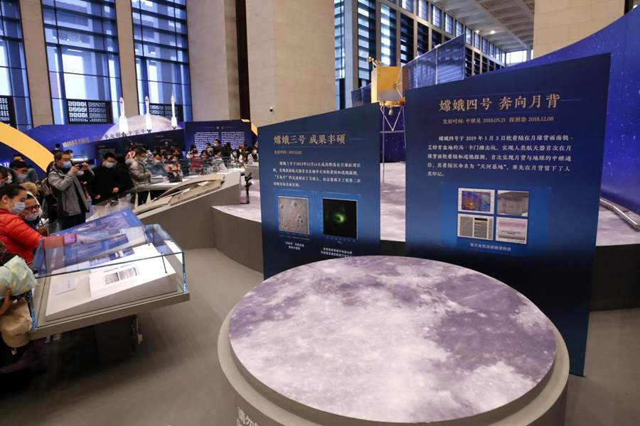 Visitors watch exhibits about China’s Chang’e-3 and Chang’e-4 lunar missions at the National Museum of China in Beijing, Feb. 28, 2021. (People’s Daily Online/Chen Xiaogen)