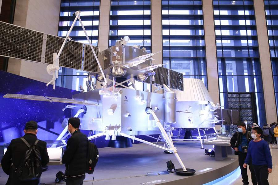 Photo taken on Feb. 28, 2021, shows visitors watching life-size models of the ascender and lander of China’s Chang’e-5 lunar mission at the National Museum of China in Beijing. (People’s Daily Online/Chen Xiaogen)