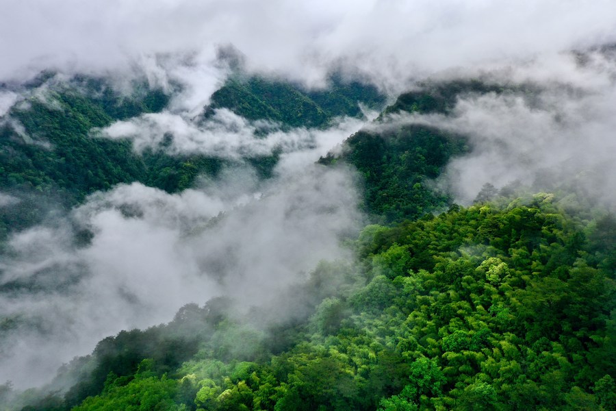 Aerial photo taken on May 17, 2021 shows the mountains surrounded by cloud and mist in Wuyishan National Park, southeast China's Fujian Province. (Xinhua/Jiang Kehong)
