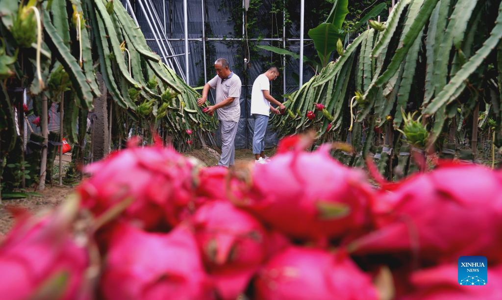 Staff members pick pitayas at Wulipu Village of Xinhe County in north China's Hebei Province, Sept. 17, 2021. Xinhe County boosts rural vitalization by developing distinctive agricultural products, improving living environment and elevating governance capability. (Xinhua/Wang Xiao)