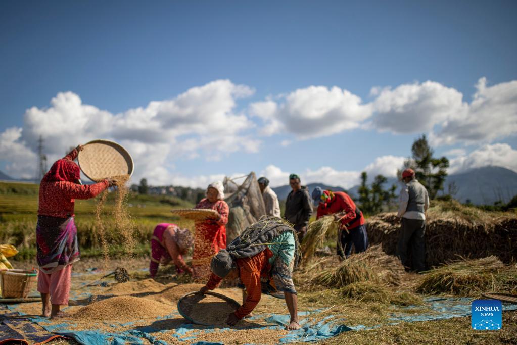 Farmers work at a paddy field in Lalitpur, Nepal on Oct. 22, 2021. Nepali farmers are busy harvesting rice as unseasonal rainfalls in recent days have damaged crops and properties in some parts of the country. (Xinhua/Sulav Shrestha)