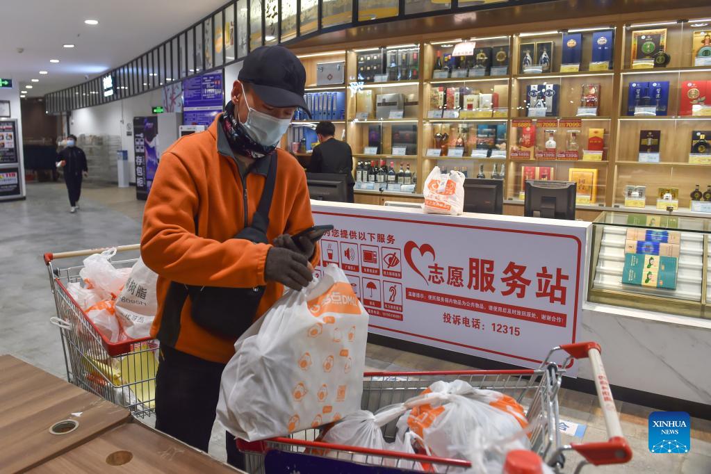 A delivery man checks goods ordered online at a supermarket in Yinchuan, northwest China's Ningxia Hui Autonomous Region, Oct. 23, 2021. Agricultural products wholesale markets, shopping malls and supermarkets in Yinchuan have taken measures to ensure the supply of daily necessities for residents. (Xinhua/Tang Rufeng)