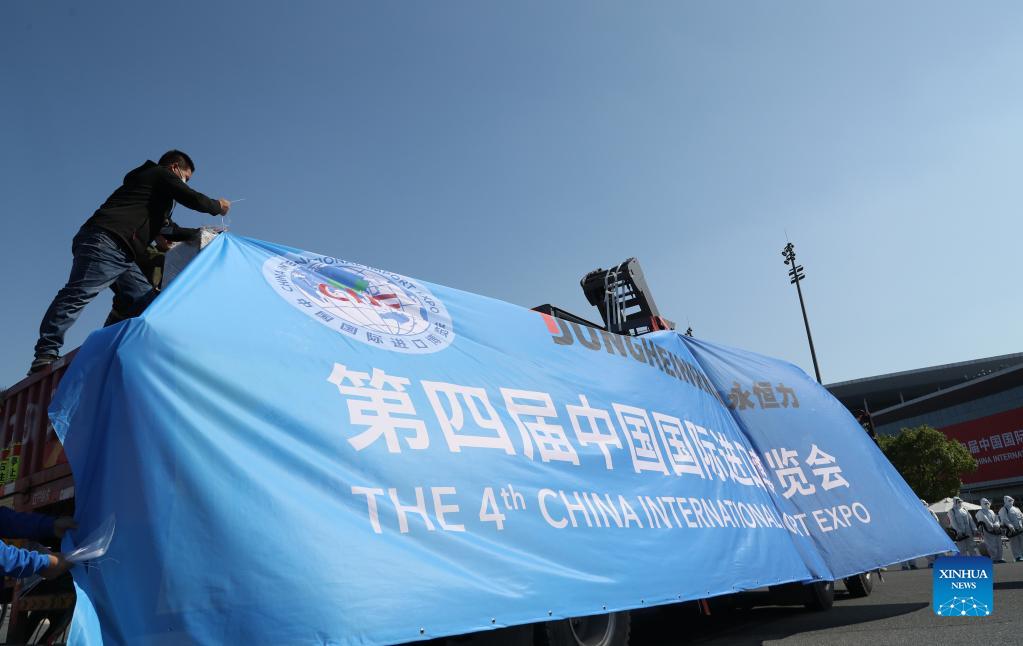 A truck loaded with the first batch of exhibits arrives at the north square of the National Exhibition and Convention Center (Shanghai), a main venue for the fourth China International Import Expo (CIIE), in east China's Shanghai, Oct. 23, 2021. The expo is set to take place in Shanghai from Nov. 5 to 10 this year. (Xinhua/Fang Zhe)